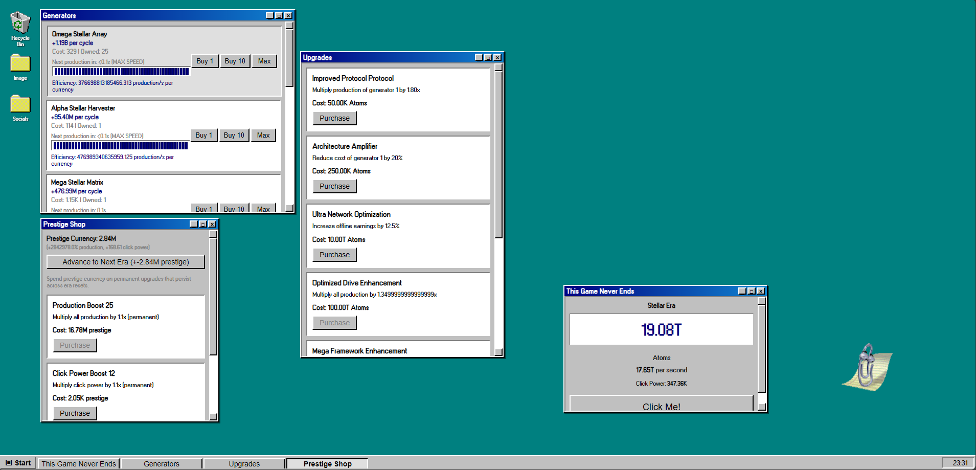 An idle/incremental game that runs in a Windows 95 desktop.Clippy is your guide through procedurally generated eras, generators, upgrades, and prestige.
